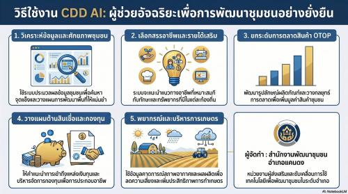 💠 โดยกรมการพัฒนาชุมชนได้เปิดตัวระบบ **CDD AI** เพื่อเป็นเครื่องมือสำคัญในการเปลี่ยนผ่านสู่การเป็นดิจิทัล (Digital Transformation) โดย AI ตัวนี้จะช่วยให้เจ้าหน้าที่ทำงานได้รวดเร็วและแม่นยำยิ่งขึ้น ซึ่งมีฟังก์ชันหลักที่น่าสนใจ 5 ด้าน ได้แก่: